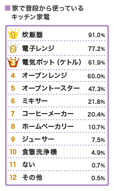 普段から使っているキッチン家電は「炊飯器」が9割以上。それ以下は、食品を加熱するためのアイテムが豊富にランクインしている。