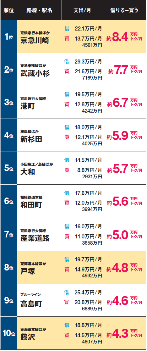 京浜急行大師線(港町、産業道路)、東海道本線(戸塚、藤沢)の2路線がランキングを占めている。その中の一つである「戸塚」は、東海道本線、横須賀線、湘南新宿ライン、ブルーラインの4路線が利用可能となった。これが資産価値を高めている一因である。そのほか、京急川崎、武蔵小杉、新杉田、大和、和田町、高島町がランクインしている。