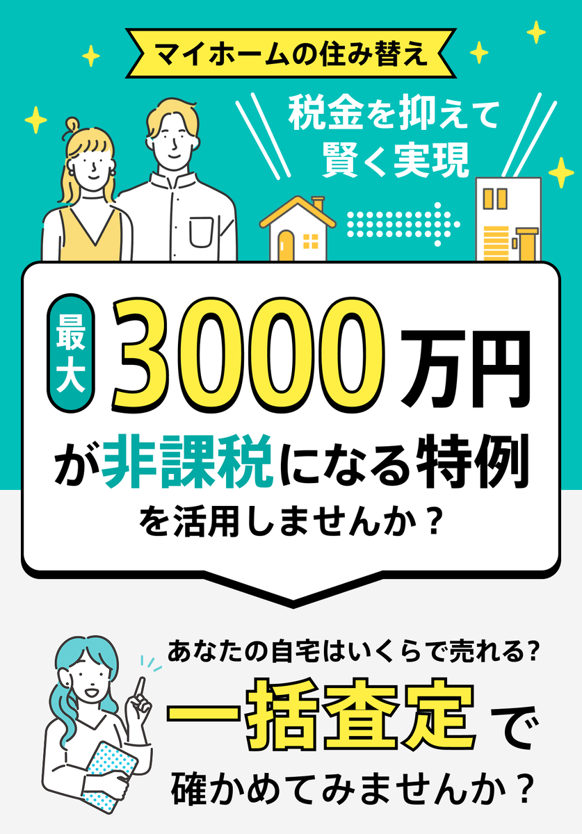2025-09-01 【マイホームの住み替え】最大3000万円が非課税になる特例を活用! 税金・控除 住み替え 売却査定 売却で利益が出た場合3000万円まで非課税 売却で損した場合所得と損益通算できる あなたのマイホーム税制優遇を活かして賢く売却しませんか?