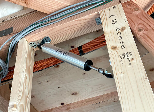 同社の家は標準仕様で「耐震等級3」をクリア。しかし、いくら耐震等級3とはいえ、地震がくれば家は揺れる。この揺れそのものを抑えるのが、標準装備のひとつとなっている、制震ダンパー「evoltz(エヴォルツ)」である。車用のショックアブソーバーの技術を応用して開発されたこの製品は、震度5の地震でも、棚の上のものが落ちない(メーカー調べ)ほどの制震性能で、家族と家を地震から守ってくれる。