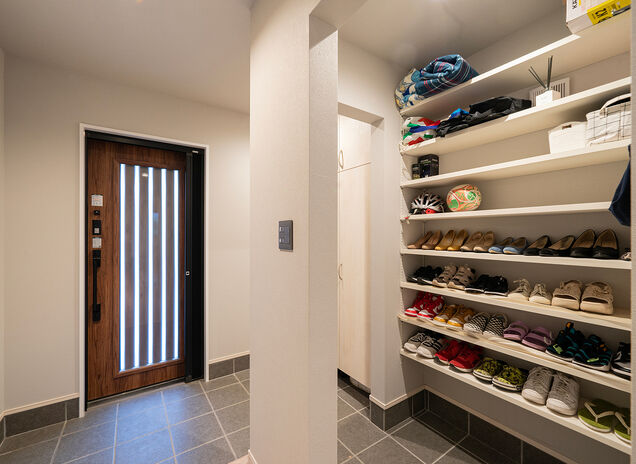 靴をはじめアウトドア用品なども、ゆとりを持って収納できる土間収納。ランドリールームの近くに設けられたファミリークローク…そんな定番の収納設備はもちろん、たとえば階段下の空間に設けられた、換気扇付きのネコのトイレなど、同社が得意とする造作仕事の経験を活かして、細やかな要望を形にしている。ほしい場所に、ほしいサイズの収納があれば、暮らしはもっと便利に、楽しくなる。