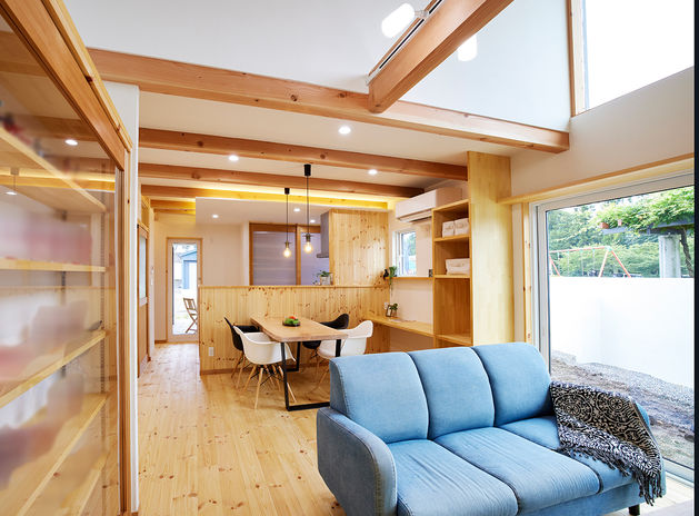 平屋は2階建てに比べると面積当たりのコストがかかることが多いため、様々な工夫を取り入れた平屋風の家も提案している。LDKや水回り、主寝室を1階にして、2階の子ども部屋を一部屋分のみにすることで、広々とした吹抜も確保した平屋感覚の住まいが実現。また、天井裏をなくす家づくりを行った場合、「建物を低めにしても天井は高いまま」が可能。建築コストを抑えながら、開放的な平屋の暮らしもできるのでぜひ相談を。