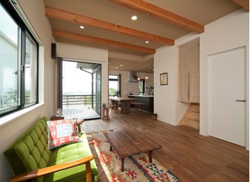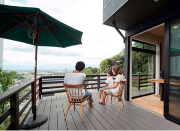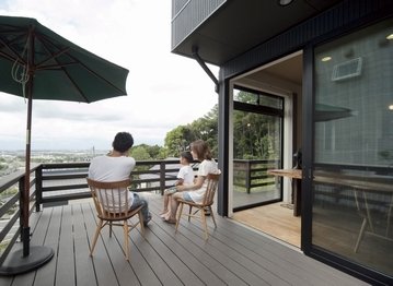 自然素材を生かした内装に、常に絶景を楽しめる空間設計が魅力のYさん邸は、吉川住建が土地探しからサポートした住まい。「土地探しからお願いしましたが、景色が抜群の立地を紹介してもらったのが決め手です。ローンやプランも丁寧にすすめてくれたので不安なく家づくりができました」とYさん。広々とLDKを囲むようにつくられたウッドデッキや窓枠を極力少なくするなど立地を活かした住まいでの生活を心から楽しんでいる。
