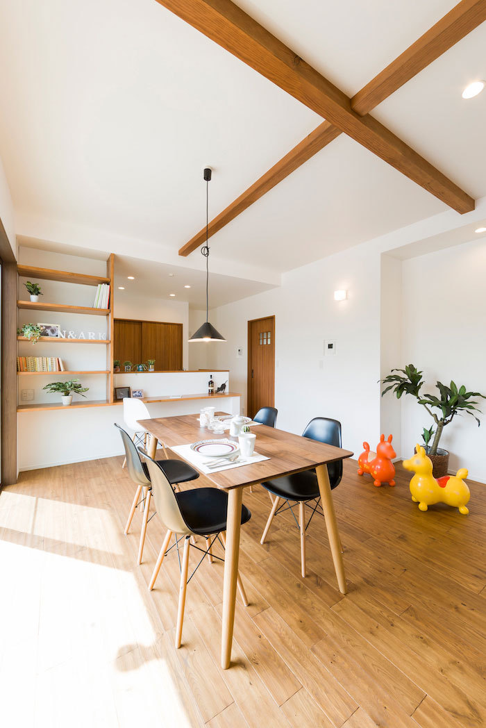 子どもが楽しんで自発的に片付ける収納や玄関からクローゼットと洗面室を通りリビングに通じる動線、キッチン収納やスムーズな家事動線など、子育て中の家事の負担を減らす間取りには定評がある。また、趣味ルームやスタディーコーナー、家族共用のフリースペースなど家族のライフスタイルを尊重しつつ日常を楽しむ暮らし方を提案。無垢の床や漆喰の壁など体に優しい自然素材を使った心地よい空間は、子どもの健やかな成長も育む。