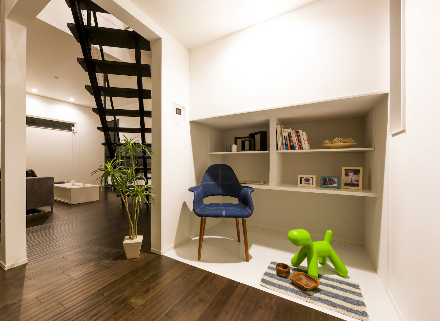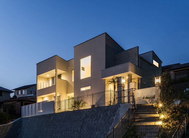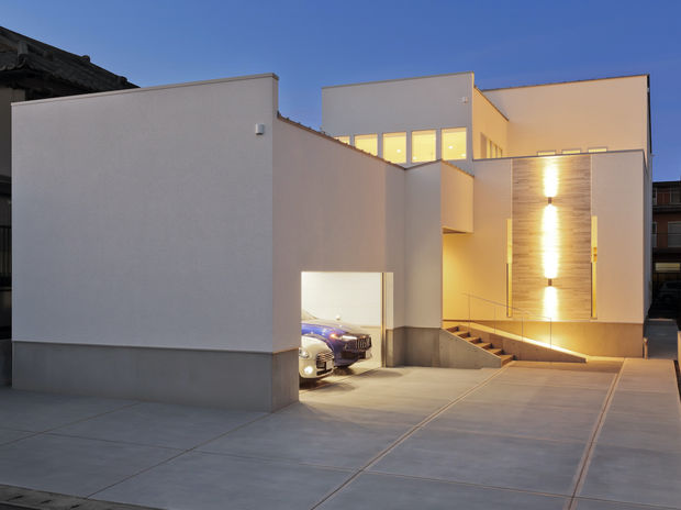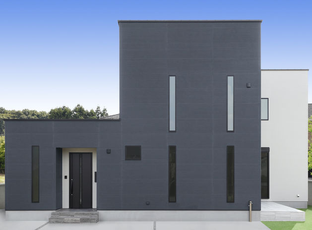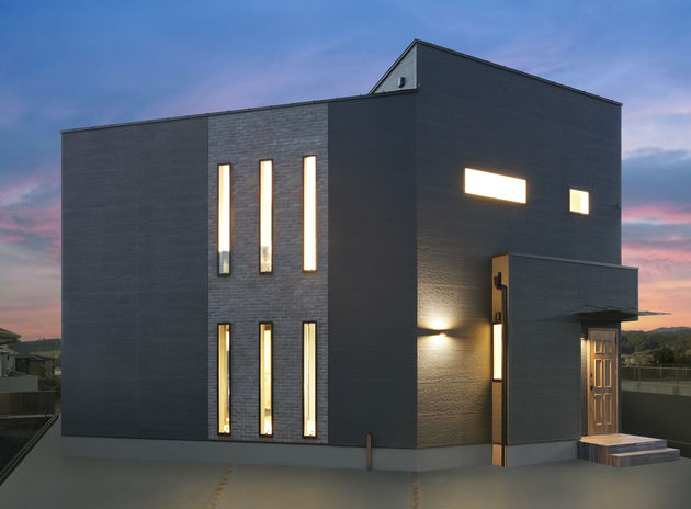 nattoku住宅では、断熱性・耐久性ともに優れたALCが標準仕様。シンメトリーやラインの美しさを取り入れたスタイリッシュなデザインが特徴。窓の位置や形状も繊細に計算されていて、外部からの視線をカバーしつつ、室内には明るく開放的な心地よさが広がっている。また、外壁の一部にアクセントウォールやライティングなどの遊び心を加え、昼と夜それぞれ異なる表情を楽むことができる。