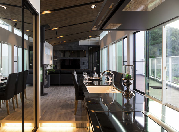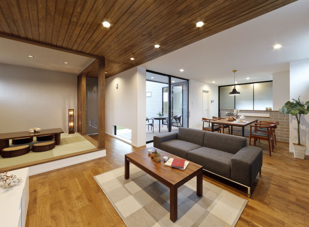 平屋は2階部分がないため、天井の高さと屋根の勾配を活かした解放感あるリビングが実現できる。平屋で懸念される収納不足も、ダイニング、キッチン、水回りをステップフロアにする工夫で、その土台部分を大容量の収納スペースとして確保できる。転落防止の木格子の手摺も心地良い雰囲気を演出してくれる。基本的には上下の移動が無く、動線が美しく、住み心地の良い平屋は、憧れる人の多い贅沢なプランと言える