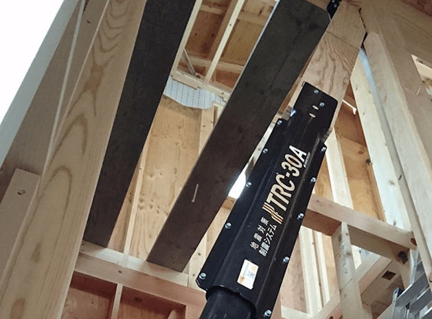 nattoku住宅では、建物の倒壊を防ぎ、居住者の圧死を防ぐよう強固な家をつくるという考え方の「耐震」と、揺れによる建物の変形を抑え、耐震工法では守り切れない繰り返しの揺れに有効な「制震」を併用。無垢の檜の柱を軸に、筋交いとパネル工法で優れた耐震性を実現。全棟に制震ダンパーを標準装備し、耐震等級3を取得している。