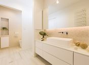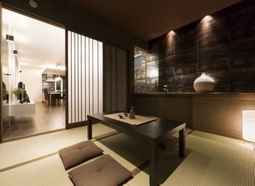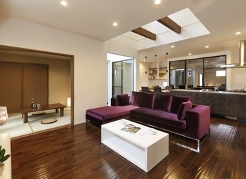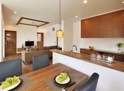 写真は、キッチン・サニタリーを各階に設置した部分共有型の二世帯住宅。両世帯が揃って1Fで食卓を囲む機会も多いためLDKを広く取り、くつろげる和室も隣接させた。1Fの親世帯はラグジュアリーなホテルライクなスタイルに、2Fの子世帯は雰囲気が一変、木のぬくもりとタイル使いが可愛らしいカフェのようなスタイルに。ご家族とはいえそれぞれ異なる好みでも、きちんとヒアリングを行うことでご家族全員が満足できる家を目指す