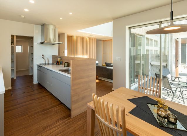 家事効率を高めて、子どもとの時間や趣味を大切にしたいと誰もが思うもの。三昭堂は、玄関からキッチン、洗面室など、回遊式のスムーズな動線など家事を行うのに便利なプランニングも得意だ。例えば、ダイニングをキッチンと横並びに配し、調理したものをすぐにテーブルに並べられるのは重宝。子どももママやパパのそばで、喜んでお手伝いしてくれそうだ。家事動線の良さなどをモデルハウスで実感してみて。