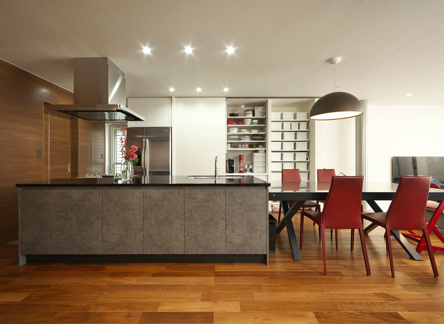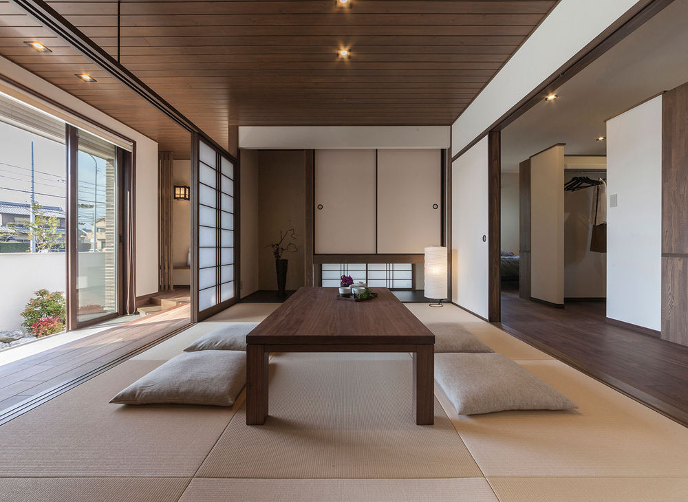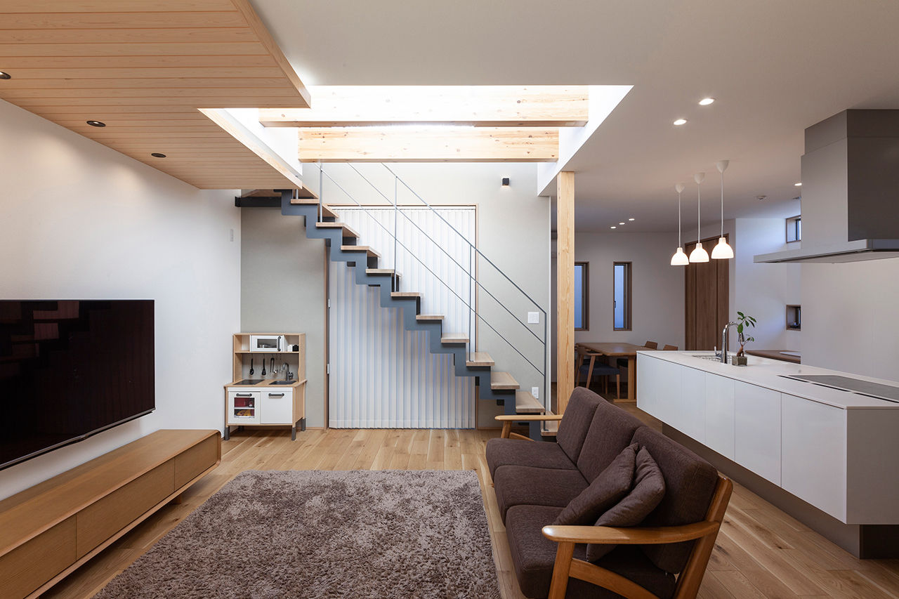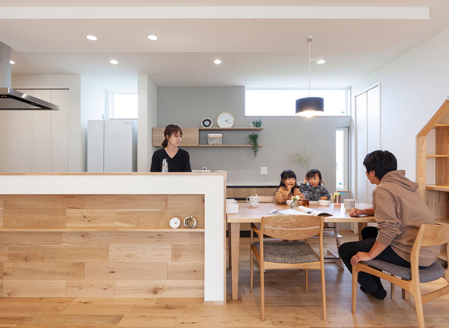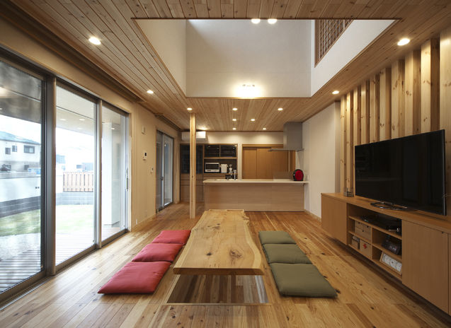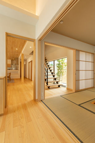 自然素材をただ使うだけでなく、素材そのものの色合いや風合いを活かして現代的なデザインを生み出す三昭堂。杉の無垢材を使用した床や天井、吹き抜けには化粧柱と大開口のサッシを設け、空間の広がりを演出。上質な素材を現代的な間取りに取り入れ、日本的家屋の美しさを表現している。将来世代をこえて永く住まう家だからこそ、素材とデザインの融和を創り出し表現していく。同社だからこそ成しえる家づくりだ。