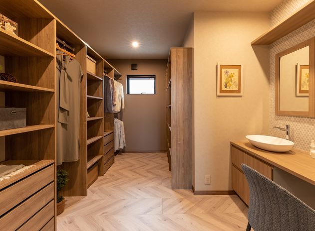 同社では、いかに居住空間を有効的に、かつ効率の良い暮らし方ができるかを考えた収納スペースの配置をする収納プランニングも得意だ。玄関に大型シューズクロークを設けてリビングにつながる動線、キッチンに引戸付きの収納棚を設置して来客時には隠せる女性目線の収納、キッチン横にパントリー、主寝室にワイドなウォークインクローゼットなどが提案されている。モデルハウスで、同社の収納術を体感してほしい。