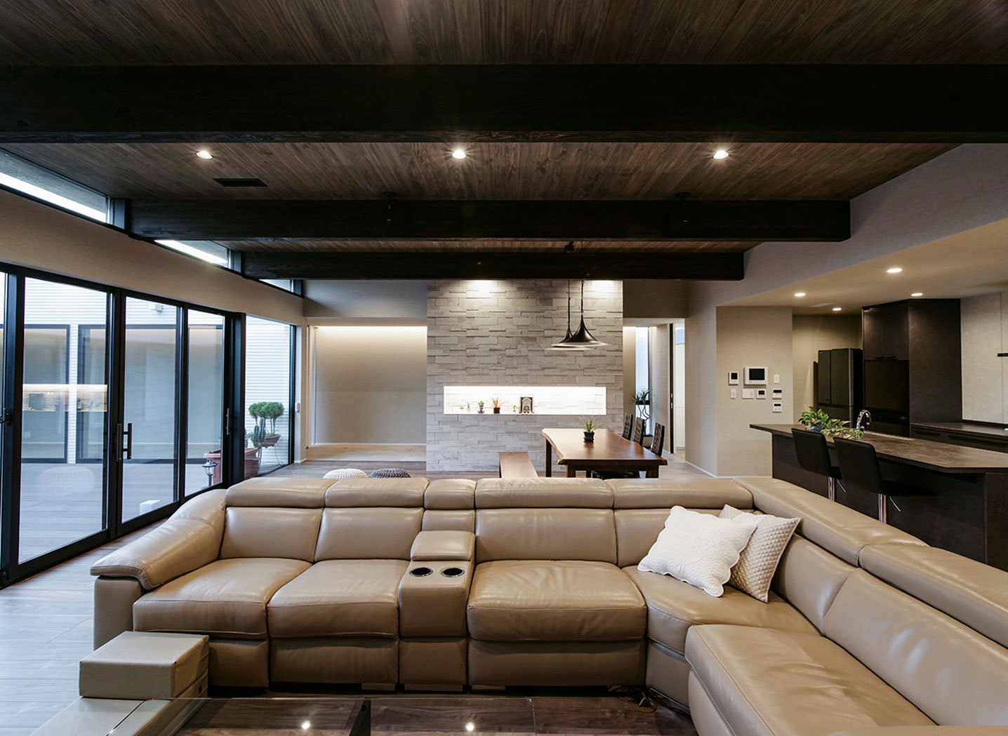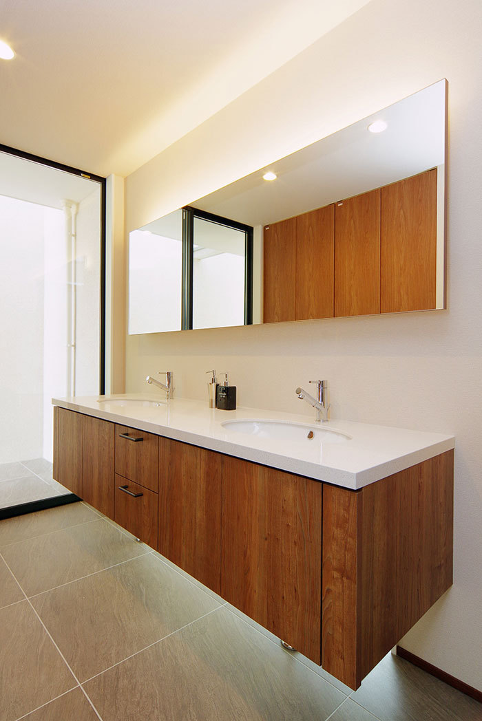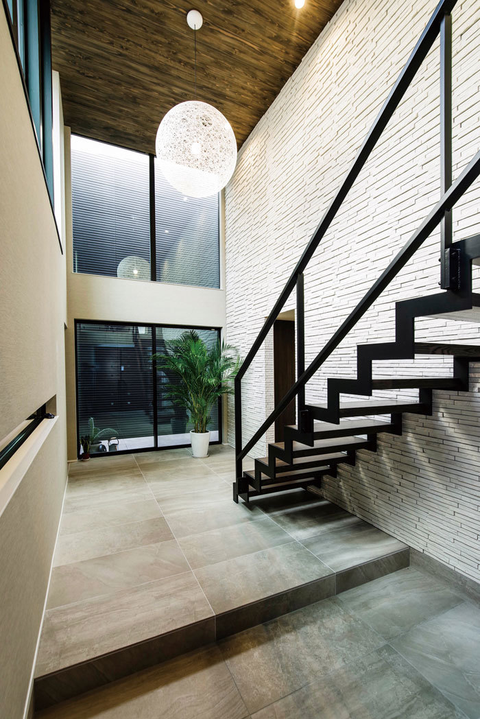 施主のKさんはかねてより平屋建築に憧れがあり、次の住まいは平屋と決めていた。しかし、本格的な和風の佇まいではなく、シンプルモダンなデザインであることが絶対条件だった。「いろいろと住宅会社を検討しましたが、単に平面的な建築というだけでワクワクするような提案がありませんでした。しかし、ビー・エル・ビルドが提案してきたプランは大胆に中庭を設け、もう一つの要望であったビルトインガレージもモダンなデザインで仕上げてくれました。そのセンスの良さはピカイチでした」(Kさん)。施主を感動させたことがもう一つあった。同社スタッフは天然石やタイルなどマテリアルにも造詣が深く、照明器具選びにも有意義なアドバイスをしてくれた。「気に入ったものが見つかるまで、とことん付き合ってくれたのはうれしかったですね」。何も諦めることのない家づくり……Kさんが体験した家づくりは特別な事例ではなく、同社にとって当たり前のことだというから頭が下がる。