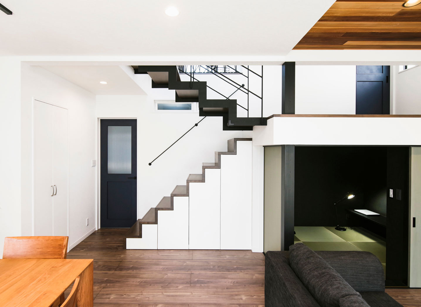 3台の車を所有する施主Oさんの希望は、「すべての車を格納できるビルトインガレージ付きの3階建て」。3台を一列に並べると間口がガレージに占領されることになり、玄関が添え物のような印象を与えかねない。こうした難題をクリアするのがビー・エル・ビルドの真骨頂。賃貸住宅などの大型物件も手掛ける高度な設計力を駆使して、意外とも思えるプランを提案した。「西側と南側の2方向からアクセスできる3台分のガレージを確保したプランでした。まったく予想外のアイデアだったので、見た瞬間は本当に驚きましたね」とOさん。玄関ホールには2つのガレージからも入れるように計画されており、雨の日などにとても便利だ。2階はご夫妻が2人のお子さんと楽しく過ごすLDK、そして3階は主寝室と子ども室と分かりやすく整理されているのもO邸の特徴だ。Oさんのお気に入りは愛車のレストアに没頭できるインナーガレージだが、工夫を凝らしたLDKにも満足しているという。「小上がりは4枚の畳を敷いたミニスペースですが、子どもたちが楽しそうに遊んでいるのを見て、つくってよかったと実感しました」とOさんは幸せそうな笑顔を見せた。