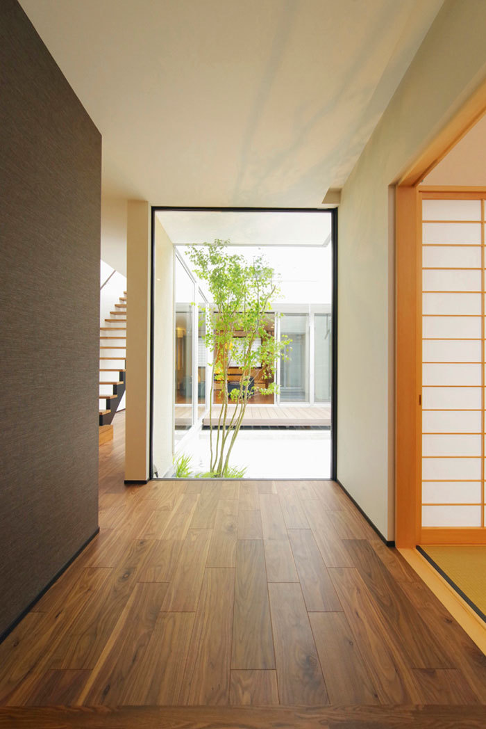 E邸は明確なライフスタイルがあり、緊張と緩和、ハレとケの使い分けなど、どうしても譲れない主張・要望があった。「建築会社選びでは、こちらの要望を素直に聞くだけの工務店ではだめだし、かといって、設計を押し付けてくる建築家というのも避けたかった。そんな中、両方の良さを兼ね備えたビー・エル・ビルドと出会って、『探していたのはこの会社だ』と思いました」とEさん。中庭を真ん中に設けて、1階を「内に開かれた」プライベートゾーン、2階を「外に開かれた」パブリックゾーンとするプランを見たときに、ハートがゾクッとしたと当時の様子を語ってくれた。「全面ガラスの2階リビングなど奇をてらったように見えても、立地を上手く生かして、外部の視線なども配慮するなど、繊細な心配りがなされており、動線なども実際に生活してみて感心するほど。要望に対するレスポンスも迅速・的確で、キャッチボールが楽しかった」。Eさん夫妻の笑顔がその満足度を物語っていた。