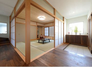 『家創りは夢創り』をコンセプトに、丁寧な家創りを行うタナベ住建。施主のライフスタイルに合わせた、理想の二世帯の住まいを提供する。施主の要望で1階部分に夫婦と母の部屋を作り、平屋部分が多い2階建の二世帯住宅を実現。派手さを抑えて高級感を演出。玄関には自動センサーを搭載し、鍵穴を使わなくても自動で施錠や開錠が出来、スムーズに自宅に入れるように配慮するなど、快適な暮らしをサポートする。