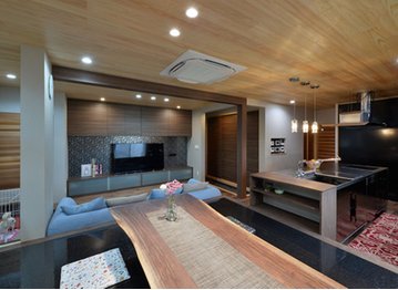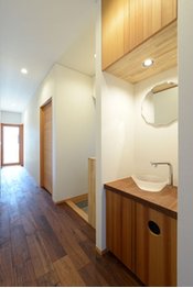 『家創りは夢創り』をコンセプトに、丁寧な家創りを行うタナベ住建。木にこだわり、木の心地よさに包まれた住まいを提供する。床にふんだんに使用したナラ材が、優しく迎え入れてくれる玄関。深い色合いで落ち着いた雰囲気を演出してくれるリビングに採用したウォールナット材。部屋中央に設えたケヤキ材の大黒柱とそれに取り付く化粧梁も存在感を示す。肌触りのよい木の温かさで心も身体もリフレッシュできる空間が完成する。