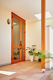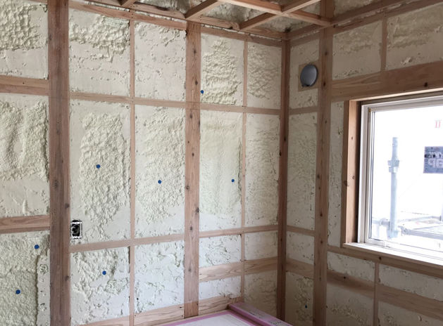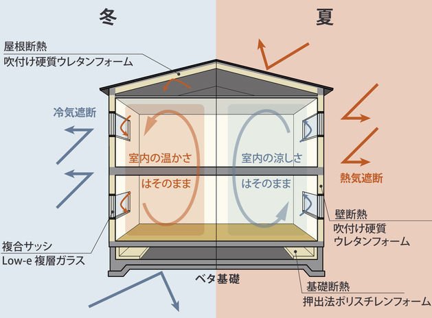 同社では細かい連続気泡で構成された断熱材アクアフォームを現場で吹き付け。外周部を4寸角柱が支えることで、分厚く隙間のない施工が可能。基礎断熱や複合サッシ・Low-Eガラスなど高気密・高断熱の仕様が加わり、家全体を包み込むように断熱。さらに、ダクトレスでメンテナンスのしやすい熱交換式の第一種換気システムが、四季を通して家全体を快適な環境に整える。全ての要素が揃うことで、同社ならではの心地良さを実現。