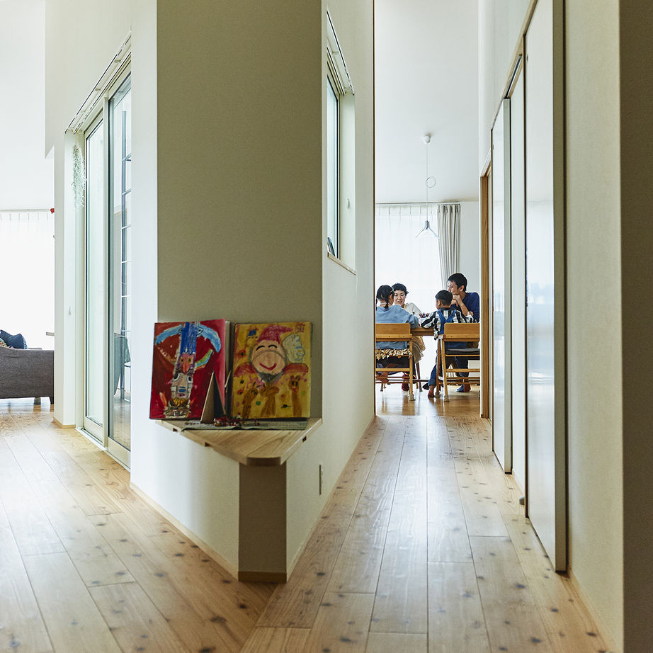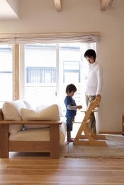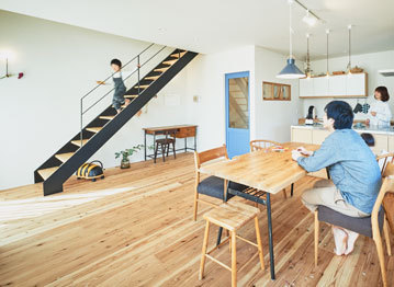 タカノホームの家づくりに欠かせない特徴のひとつに、大分県産の「津江杉」がある。家に帰ってくるとすぐに裸足になりたがる子どもだちは、「津江杉」の良さを肌で実感しているようだ。木のぬくもりや木自体の色を活かしたナチュラルな家の中では、大きな窓から光がふんだんに降り注ぎ、心地よい風が吹き抜けていく。厳選された自然素材と緻密な計算が施された空間は、住めば住むほどに味わいを増し、愛着の増す家になっていく。