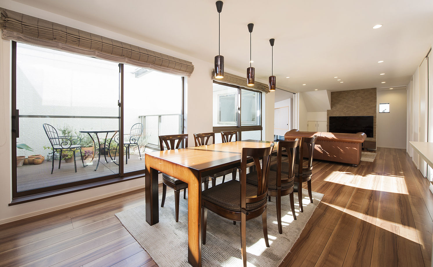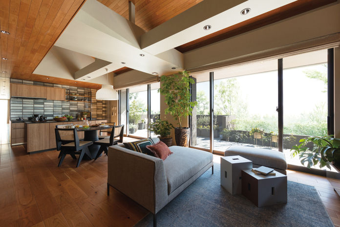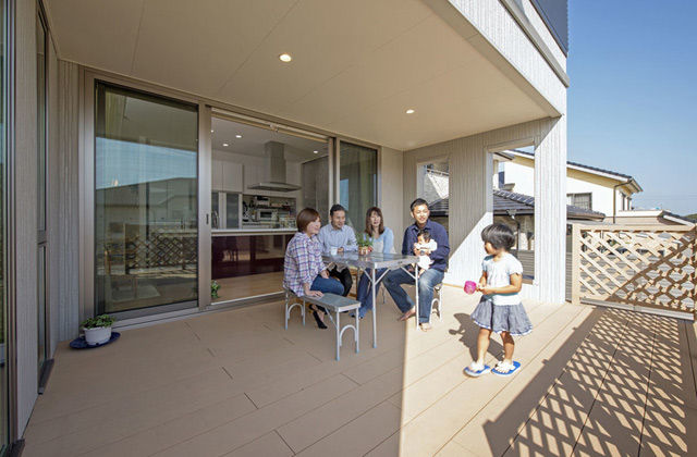 大きな窓に囲まれた、大空間のリビングダイニングが印象的な家。深い軒の下にウッドデッキなど外とつながるスペースを設けることで、平屋の魅力をたっぷり満喫できます。スマート・エアーズとトヨタホームの高い断熱性能で、暑さや寒さを抑えて、快適にすこやかに過ごせます。