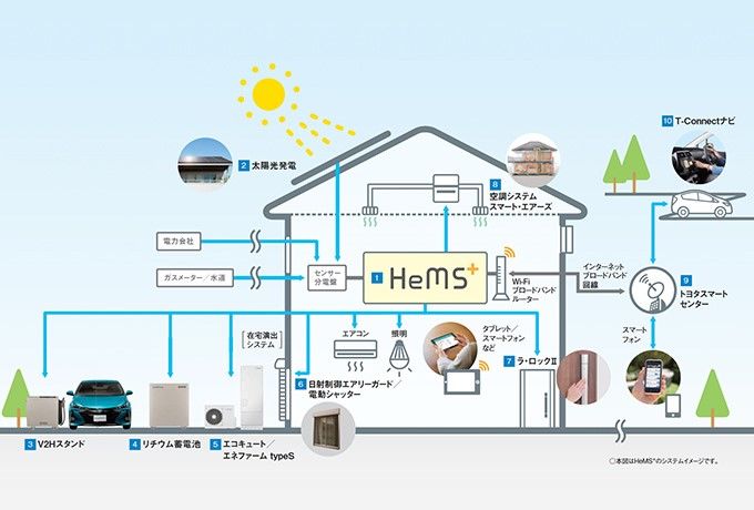 スマートハウスを先駆けて開発してきたトヨタホーム。断熱性の高い住まいをベースに、高効率エアコンやLED照明などの省エネルギー機器、太陽光発電をはじめとした創エネルギーシステム、それらをコントロールするHEMSを活用し、先進的なゼロ・エネルギーハウスを実現する。使うエネルギー以上のエネルギーを作り、光熱費や環境への負担を気にせず、一年中快適に暮らせる住まいだ。