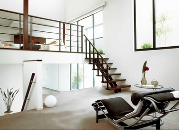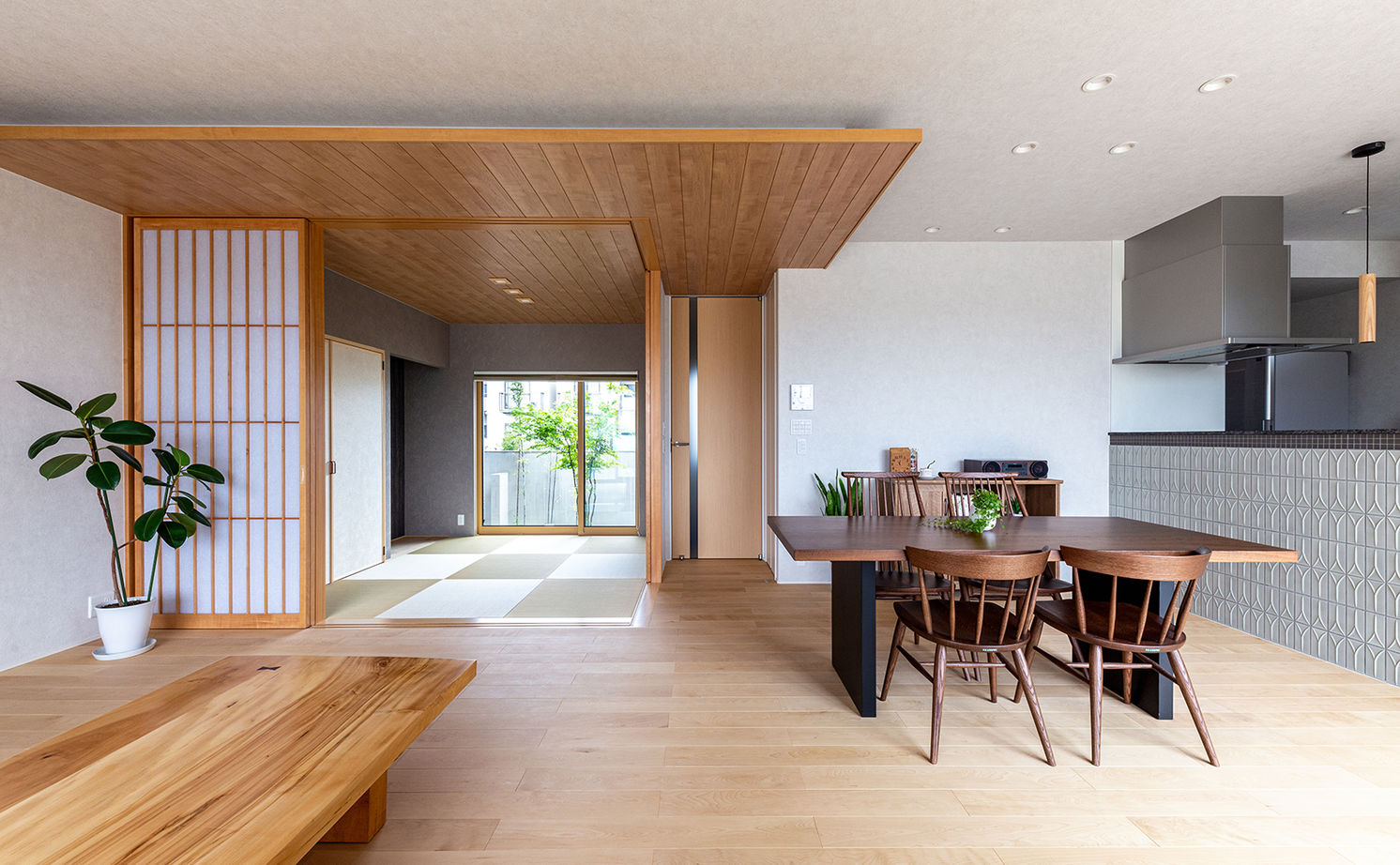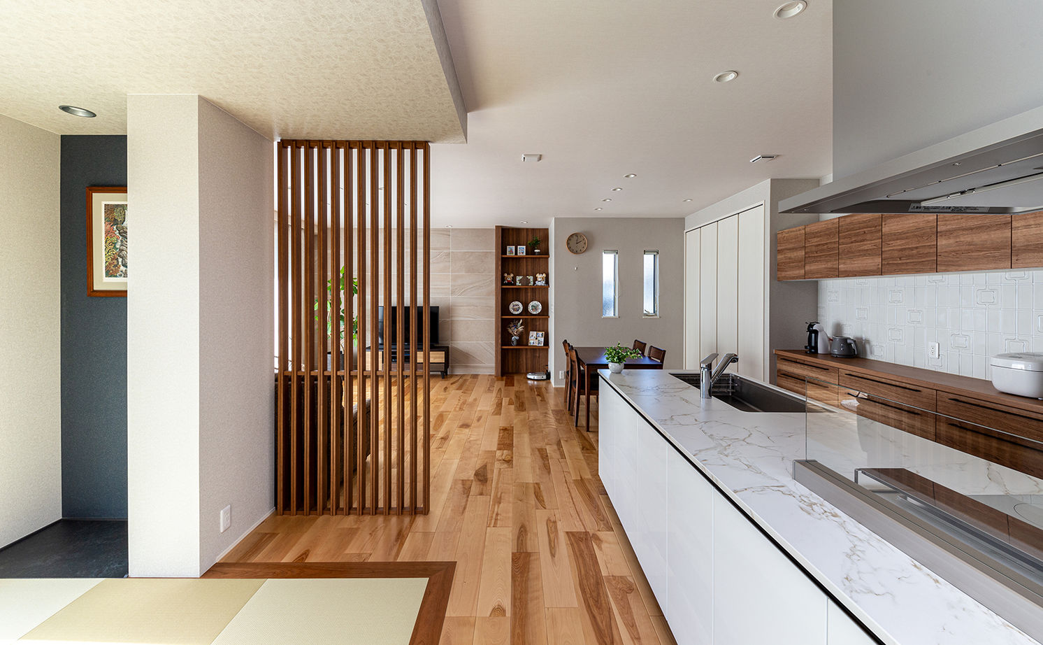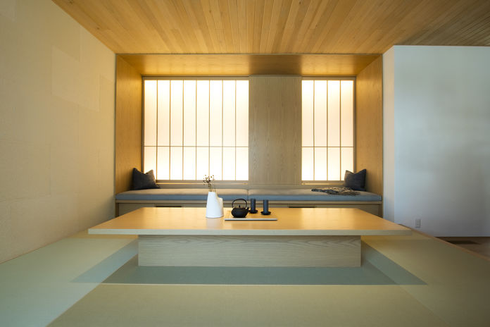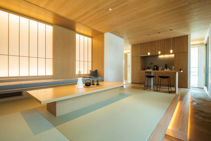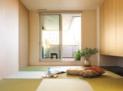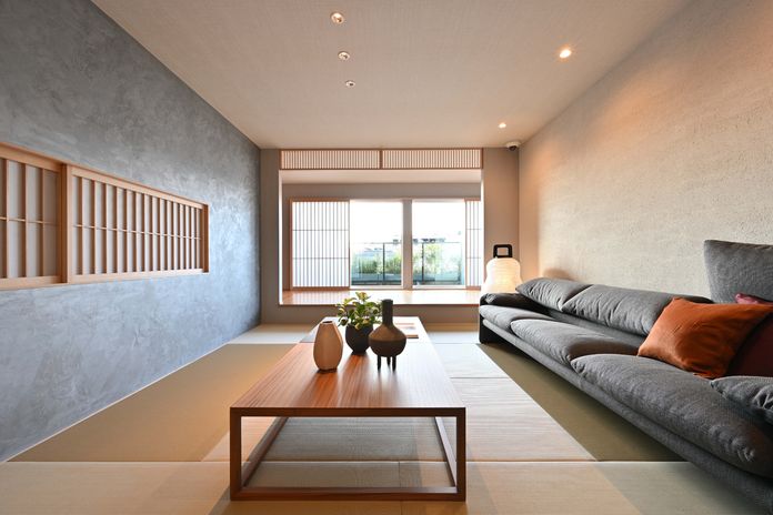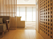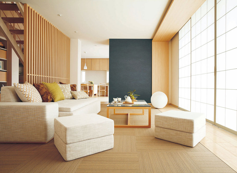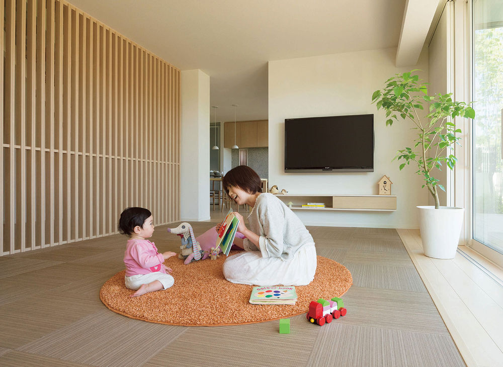 日本の伝統的な”座”の文化を現代のくらしに受け継いだテキスタイルフロアは、織物の持つ凛とした表情にサラッとした心地よい足ざわりを兼ね備え、和モダンの風情を演出するエッセンスに。縦格子がシンプルな室内に自然となじみ、空間のデザイン性を高めるだけでなく、風と光を住まいの中に届ける。