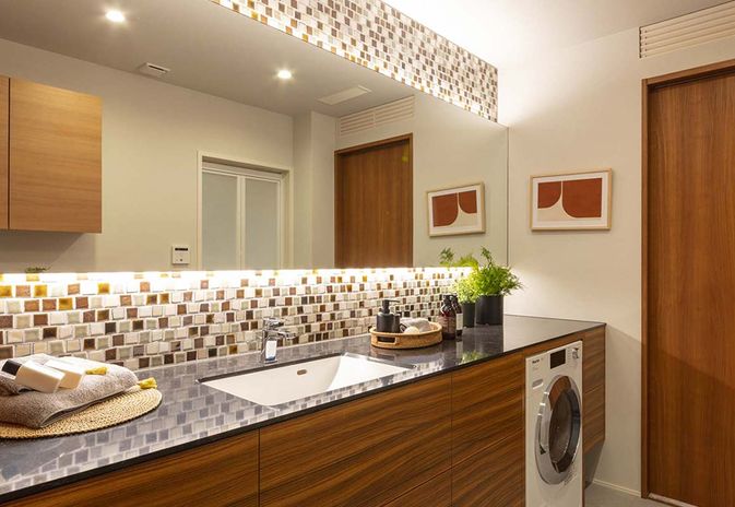 トヨタホームが考える家事ラクポイントは、「家事スペースの距離を近づける」「収納を適所にちりばめる」「空間を組み合わせる」の3つ。キッチンを中心に洗濯・洗面室・物干し場を短い動線でつなぎ、日用品は使う場所の近くにそれぞれ収納を設けて片付け上手に。家族の生活の流れを考え、家事室や収納、カウンターなどを組み合わせると、家事も身支度も1つの場所でできてさらに効率のいい住まいになる。