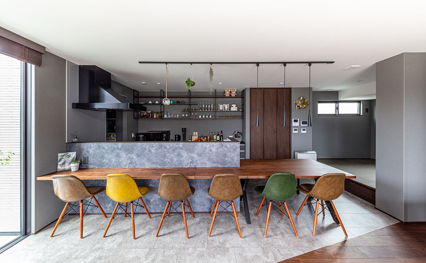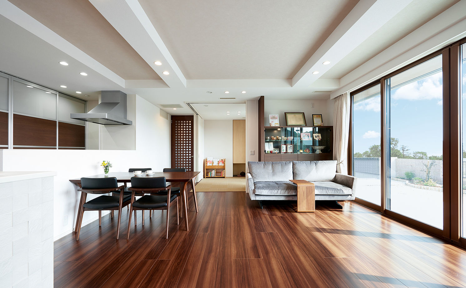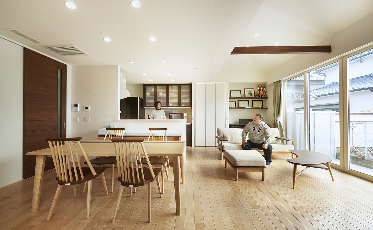 アメリカ赴任時に住んでいた平屋をイメージして建てることにしたTさん。柱や壁の制約が少なく、大開口・大空間が可能で、しかも耐震性に優れた工法を検討したところ、強靭な構造体を採用しているトヨタホームの鉄骨ラーメンユニット工法なら実現可能であることが判明。「トヨタホームの躯体は現場で10cm単位で動かすことができる」と聞き、間取りや建材の自由度が高い点にも好感を持った。また、アメリカで全館空調に慣れていたTさんは、一時帰国時に以前の家の寒さに驚き、全館空調をつけることも譲れない条件になった。「もちろん、担当者の人柄も決め手になりました。営業担当の方はどちらかと言えば寡黙で、私たちの無理難題を落ち着いてしっかりと聞き入れてくれて。その上で、『どうかな』ということについてはプロの視点でアドバイスをくれました」。全館空調の機械のメーカーも確認した上で、安心してトヨタホームに依頼。「営業、設計、デザイナー、工事…各担当のみなさんもとてもフランクで、気持ちのいい人たちばかり。『一緒に家をつくりあげた』という気持ちになれた点でも、トヨタホームで建ててよかったです」と喜ばれている