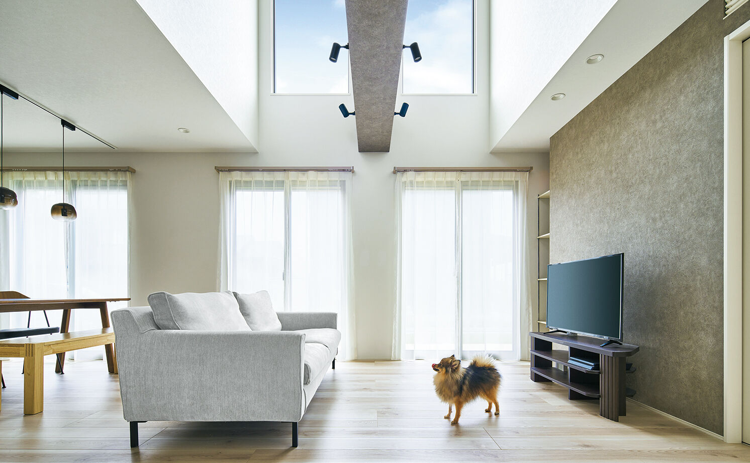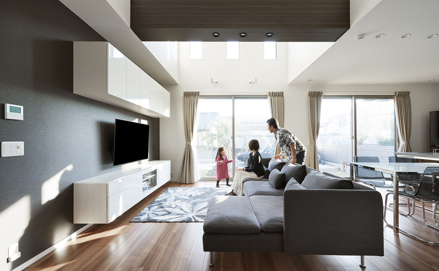 共働きのTさん夫妻が新居にまず求めたものは、「家事をラクにこなせること」。そして、花粉症対策としての全館空調と、耐震性の高さだった。ハウスメーカーは耐震性の高い構造が標準になっていることが多いので、まずは住宅展示場を3カ所訪問。デザイン性が気に入った4社でプランを出してもらったところ、早い段階からしっかりとした図面を出したのがトヨタホームだった。設計担当者、インテリアコーディネーターが同席し、その場で直接やり取りをして、サクサクと理想の「家事ラク」プランを完成させた。家づくりを始めた当初は、自分たちがやりたいことができるのか不安に思っていたTさん夫妻だったが、契約前の段階で納得のいくプランができたことで、安心して依頼ができたそう。さらに、展示場でトヨタホームの全館空調を実際に体験し「風が体に当たらないのに、廊下まで家じゅうどこも快適」であることを実感。全館空調を積極的に導入している印象を受けたことも安心感につながった。人が集まりやすい家にしたかったTさん夫妻にとって、トヨタホームの強い構造が可能にする、柱のない20畳超の大空間も魅力的だった。家が完成し、「図面で見ていたものが、理想通りの形になった」と喜ばれている