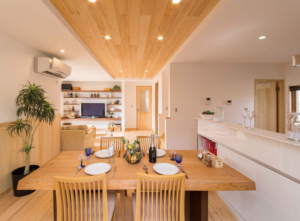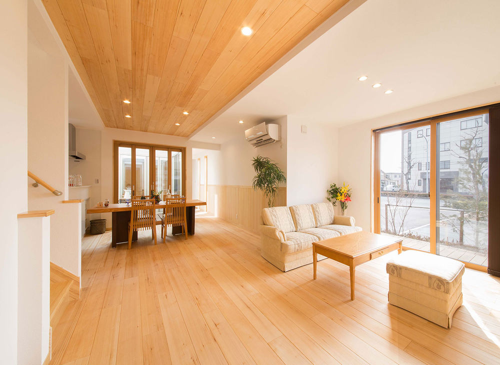 同社の家づくりのコンセプトは“自然素材で育む100年の家”。内装材に用いられるのは、1本のモミの木からわずかしか採取できない調湿性に優れた「柾目板」。自然乾燥し森の中に生息する木の状態に近づけているため、さわやかな香りが室内に満ち、タバコやペットなどの臭いを消臭し、ダニやカビも抑制。木の弾力が足腰に優しく素足に快適な上、化学物質も分解してくれる。まさに心も体も安らぐ住まいだ。