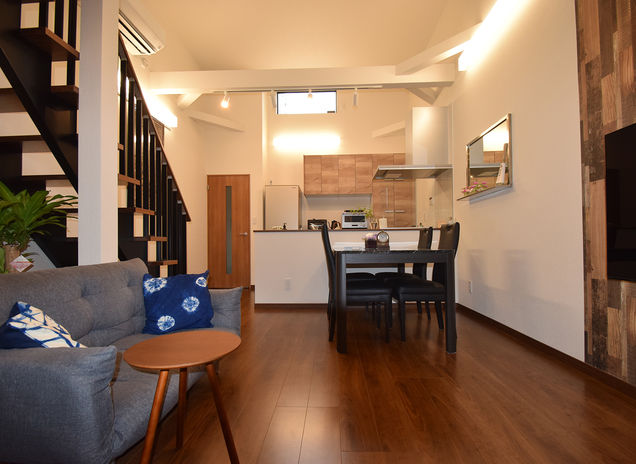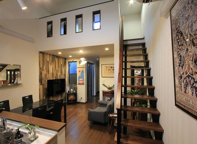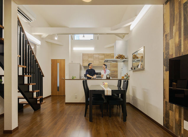 「狭小地も変形地も関係なく、お客様が望む場所に満足のいく家を建て切りたい」と語る、吉岡代表。施主にとって思い入れやご縁のある土地をキャンバスに、その土地のポテンシャルやロケーションを徹底的に調べ上げることからプランニングを開始。写真は長屋の一角を切り離した間口4m・29.9坪の土地に建てた13.9坪の超狭小平屋だが、吹抜けの高い天井、スケルトン階段、ロフトなど、広さを感じさせる工夫が随所に盛り込まれている。