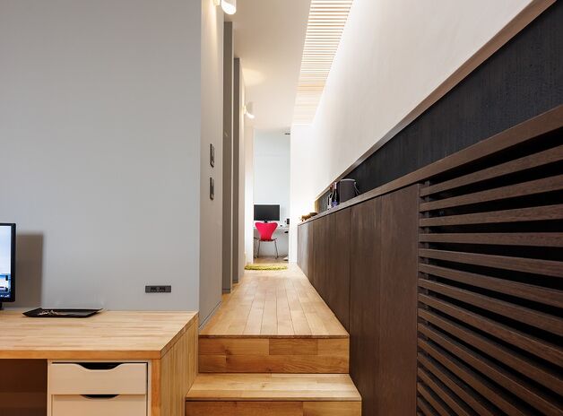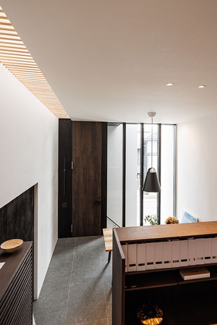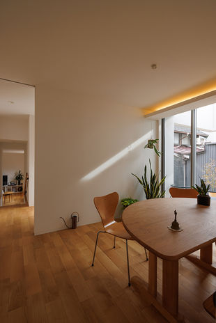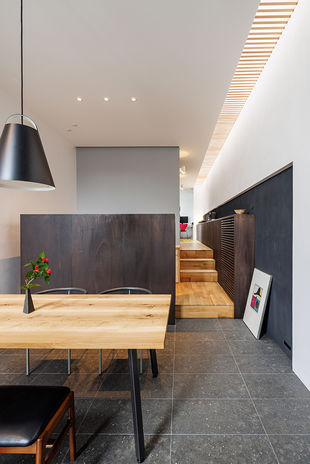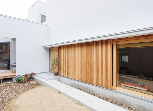 マテリアル・パレットの二世帯住宅は、二世帯を完全に分けることなく「二世帯の家族が集う場所」を考える。パーソナル空間は広くゆったりと。プライベート空間はそれぞれの家族の必要な物を揃える。その分け方は完全に分断するのではなく、数段の段差で分けたり、中庭や収納を挟んで分ける。互いのプライベート空間は目線が合わない間取りがポイント。ただ一緒に暮らすのではなく、そこに会話や笑いが生み出される場所を考え抜く。