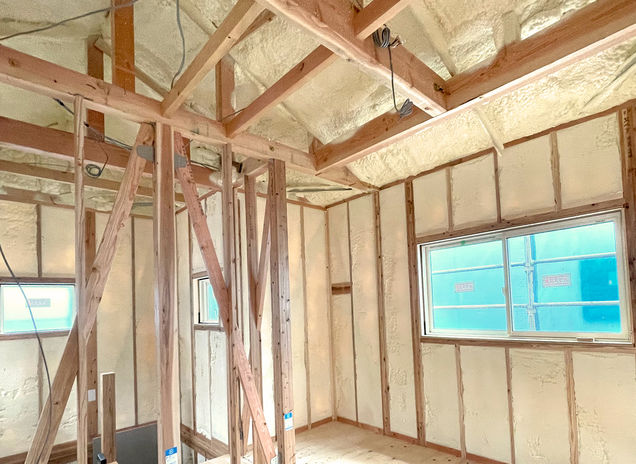 タカシン・ホームは、標準でも高気密・高断熱を実現。断熱材は健康面に配慮し、化学物質を含まない、人と環境にやさしい吹付断熱材を採用。現場で壁に直接吹き付けることでスキマのない高気密住宅となる。開口部は、高性能断熱サッシ+複層Low‐Eガラスのハイブリッド窓を採用することで家中をしっかり断熱、外気に影響されにくい 快適な暮らしを実現できる。