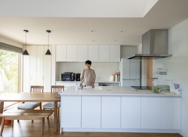 アーキテックプランニングは家事がラクになるプランを重視。オープンの対面キッチンは料理や後片付けをしながら家族の様子がわかり安心。アイランドキッチンは作業スペースが広く様々な方向から使え、複数人で作業ができる。さらに、冬、外で洗濯物を干せない北国では室内干しスペースが必須。ランドリールームがあれば、黄砂や花粉なども気にせず干せる上、洗う、干すの動作が同じ空間でできて動線が短く、家事の時短を叶える。