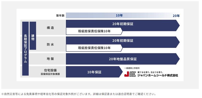 【建物長期保証】初期保証20年(瑕疵保険10年+建物保証10年)、【設備保証】初期保証10年(メーカー保証1~2年+JHSの設備保証)、【地盤調査・解析・品質保証】地盤品質保証20年(JHSの地盤サポートシステム20年)