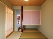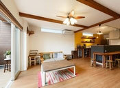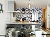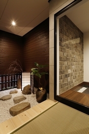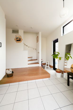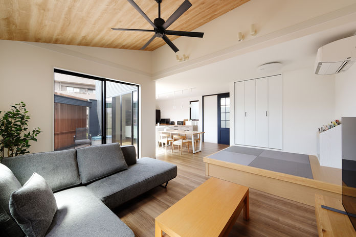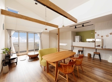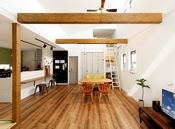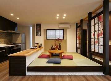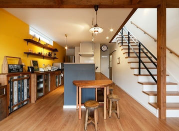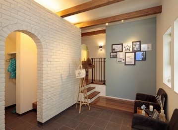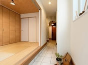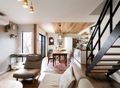 玄関を一歩入れば、そこは世界に一つの自分だけのこだわり空間。天井の梁やリビングの木の格子、木質感を感じる居心地の良い空間を演出したり、自然素材をたっぷり使い、独創的なデザインの中に「和」の心地よさも感じられる遊び心溢れる空間設計が魅力だ。和の趣と現代の快適さを融合させた経年変化を楽しめる住まいとなっている。