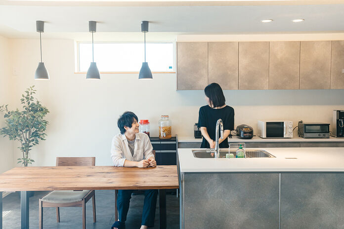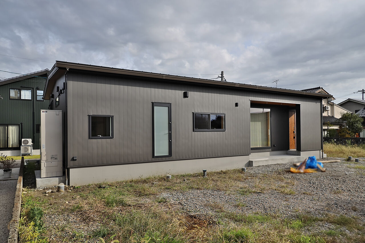 アパート暮らしだったH様ご夫婦。子育てや老後のことを思うとそろそろマイホームが欲しいと考え始め、何社もの住宅展示場を回っていた。最終的にタカノホームを選んだ理由は「木の温もりを感じられるところ、高気密高断熱で住む人にも環境にも優しいところ、耐震性能が高いところなど、安心して暮らせる家がつくれると思ったから」。打合せの段階で「平屋にすごく憧れがあった」という奥様の希望と、「実家の窓が北向きだったせいで家の中が暗かったことが嫌だったので、新居には南向きの窓がほしい」というご主人の希望もあり、新しいマイホームはLDKの南側に大きな窓を二つ取り付け、さらに勾配天井で開放感をアップさせた。窮屈さを感じさせない広々とした間取りながら、耐震等級3なので地震にも強い。そのほか、リビングのアクセントクロスの色などもこだわりポイント。ワンフロアゆえのスムーズな生活動線や高い住宅性能で、老後まで過ごしやすい快適な平屋が完成した