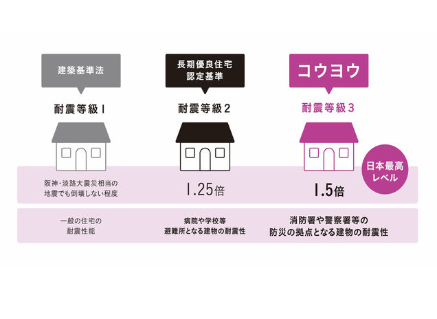 コウヨウでは、全ての住まいに高い耐震性能を装備し、耐震等級3を取得している。さらに万一の地震の際に建物の揺れ幅を低減する制震ダンパー「MIRAIE Σ」を採用。構造計算は「許容応力度計算」による詳細な計算を行い、慎重に確認する。松山本店の『未来住宅研究所』内の展示ルームでは、建築の基礎知識や実際に見えづらい躯体性能についてさまざまな資料を展示。楽しく学びながら「強い家づくり」について知ることができる。