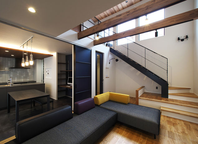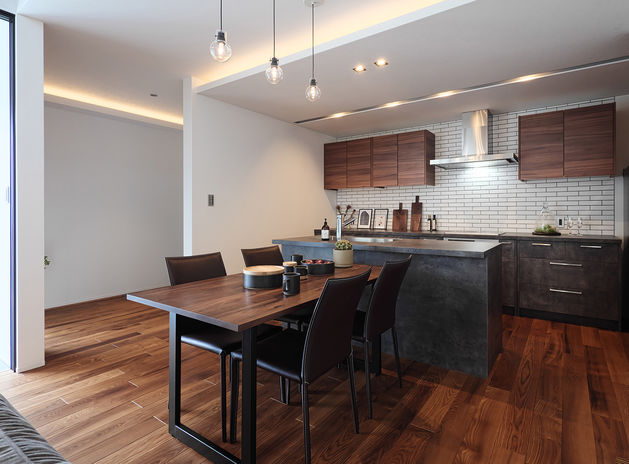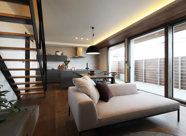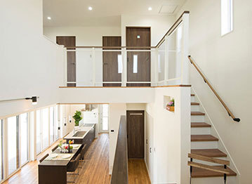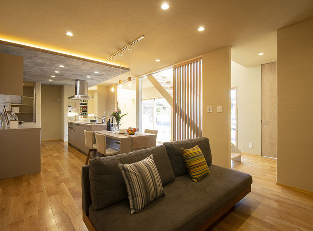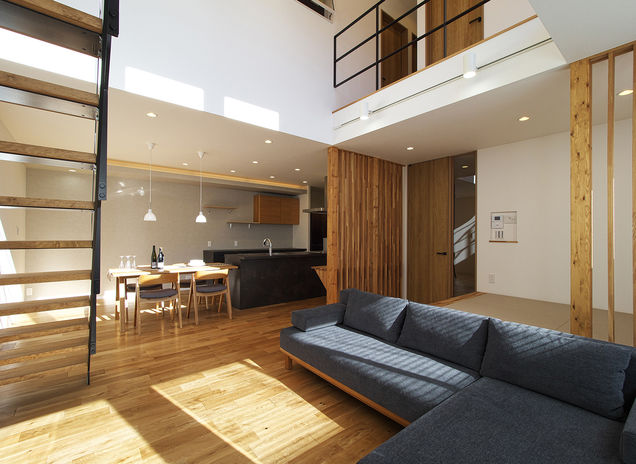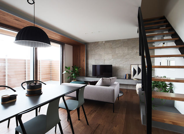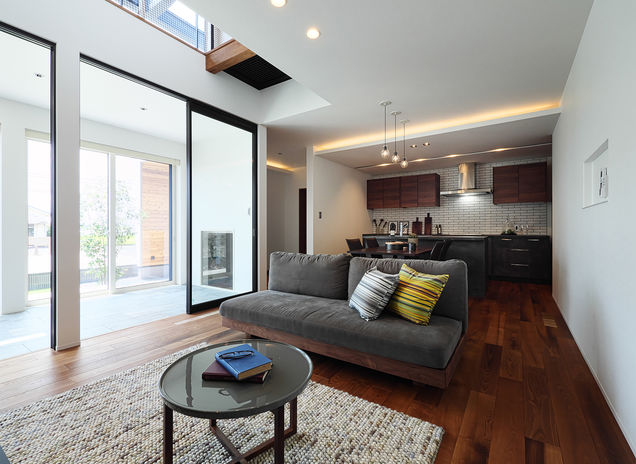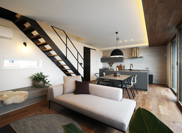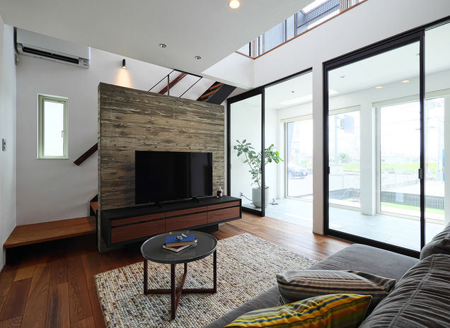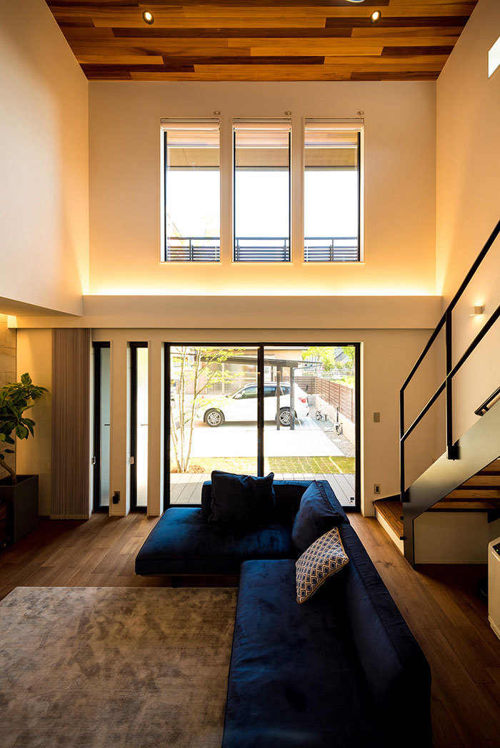 ぬくもりのある木の床に、アイアンやタイル、天然石など素材感のよいものを取り入れたおしゃれでカッコイイ家づくりをめざすなら、あおぞらホームへ。空間に合わせた造作をはじめ、間接照明による光の演出、暮らしが整う収納計画にも力を注ぐ。自然光や風など自然エネルギーを活かしたパッシブデザインを採用。風景や青い空を切り取る窓、吹き抜けを設けながらも、外からの視線を遮る設計により、居心地のいい空間を実現している。
