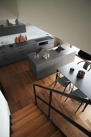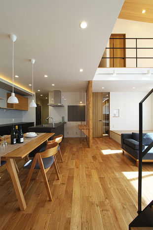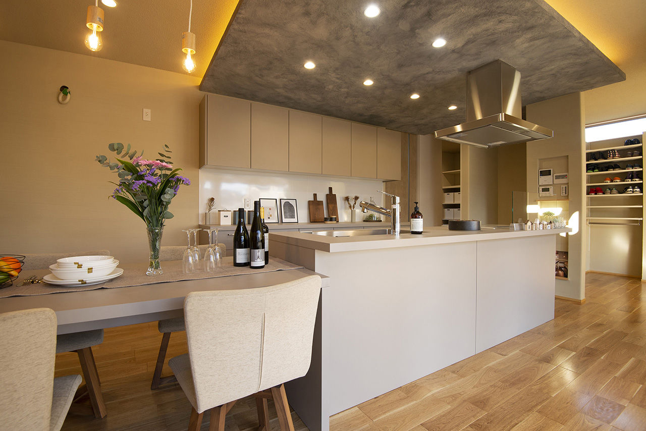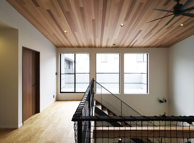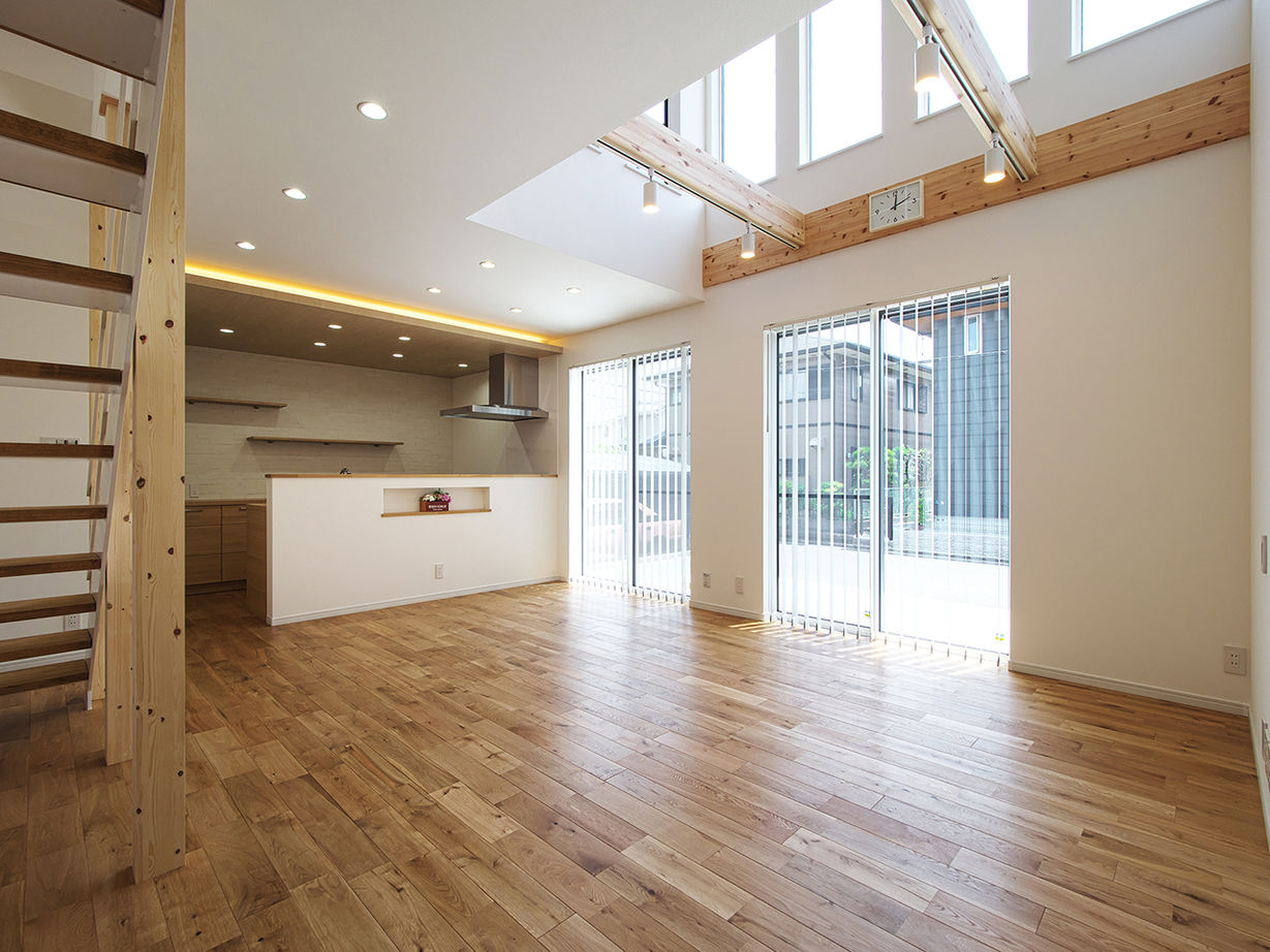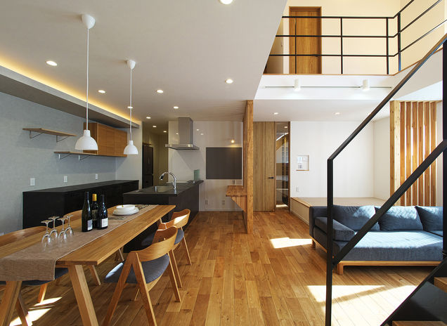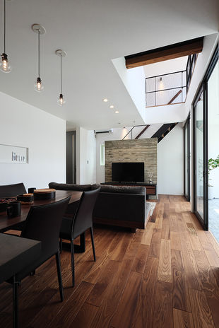 ぬくもりのある木の床に、アイアンやタイル、天然石など素材感のよいものを取り入れたおしゃれでカッコイイ家づくりをめざすなら、あおぞらホームへ。空間に合わせた造作をはじめ、間接照明による光の演出、暮らしが整う収納計画にも力を注ぐ。自然光や風など自然エネルギーを活かしたパッシブデザインを採用。風景や青い空を切り取る窓、吹き抜けを設けながらも、外からの視線を遮る設計により、居心地のいい空間を実現している。