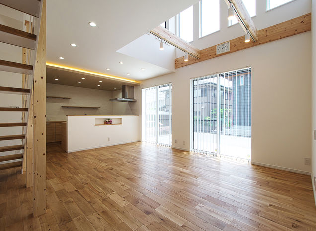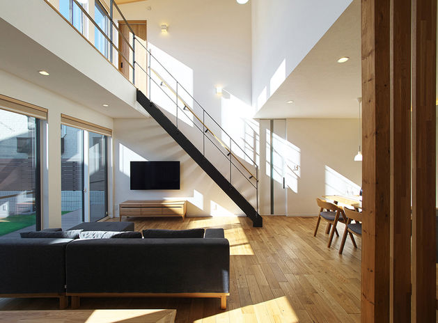 あおぞらホームではすべての注文住宅で法律が定める基準値の1.5倍もの耐震性能を証明する耐震等級3を取得している。住宅の価格によって安全性能に差をつけられないからだ。しかし、木造住宅で耐震性能を上げるためには空間を遮る耐力壁を増やすことになり、開放的な大空間と耐震性を両立するのが難しい。そこで、木材と金属のハイブリッドでシンプルな構造を生み出すSE構法を採用し、広々としたリビングや吹き抜けを実現している。