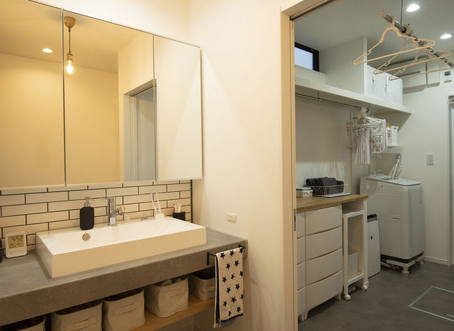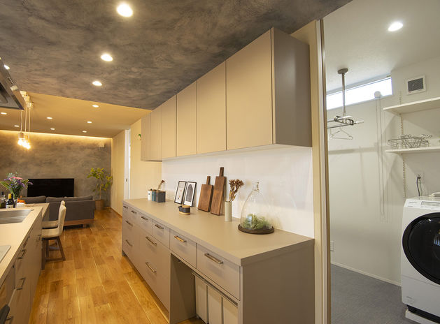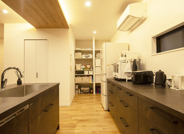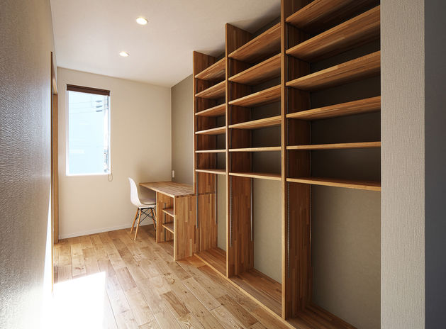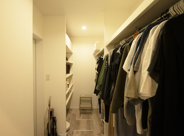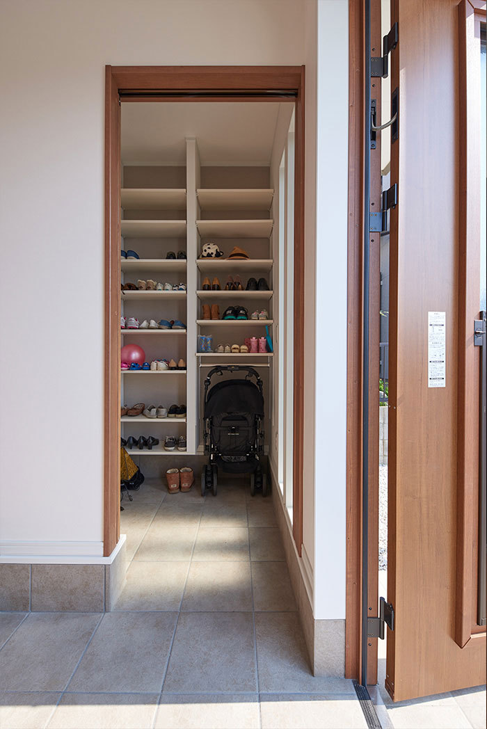 生活者目線でしっかりと動線や収納にこだわった家づくりを行うあおぞらホーム。例えば、ランドリールームの延長線上にファミリークローゼットを設けることで洗濯動線がラクに。あるいは玄関→パントリー→キッチンの配置で買い物帰りの動線をスムーズに。お施主様それぞれのライフスタイルを深掘りし、その人のための収納を計画。置くものに合わせ、収納内部の作り込みもしっかりと行っている。