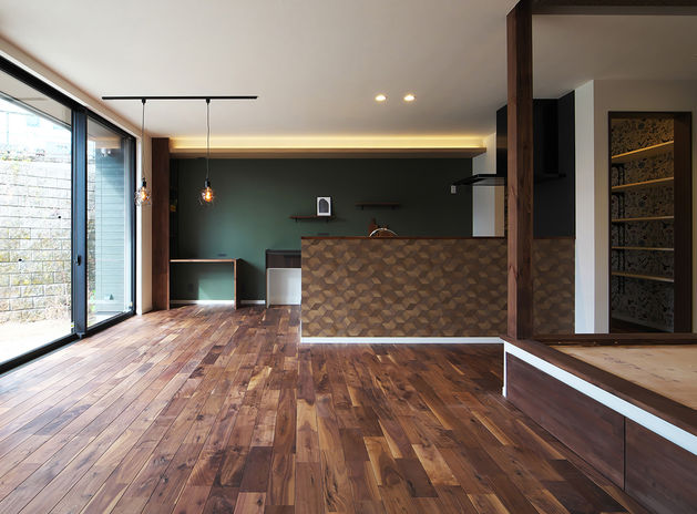 あおぞらホームでは全棟、1階部分は無垢材の床を標準採用。オークやウォールナットなどを選定することで、ほっこりとした雰囲気にならず、カッコよく仕上げている。その他にも漆喰や珪藻土、タイル、アイアン、天然石など、デザインに合わせて採り入れ方を工夫。外観にもアクセントとしてレッドシダーなどの木を採用している。自然素材を使っておしゃれに建てたい、そんな人から注目を集めている。