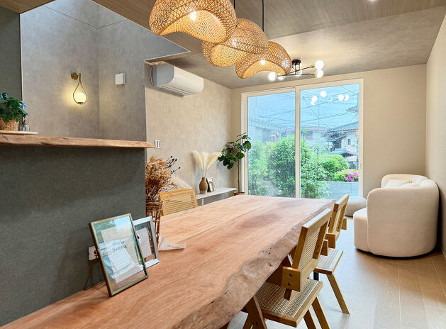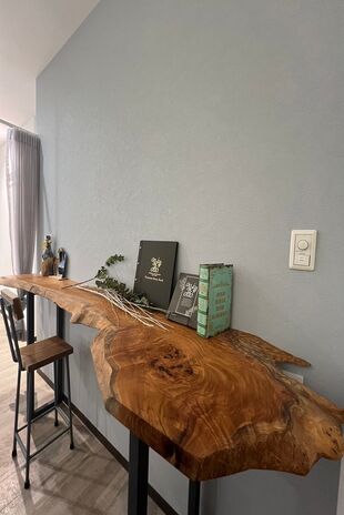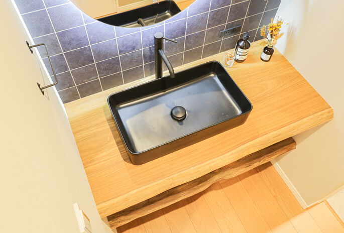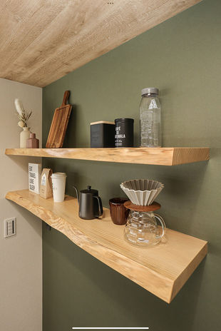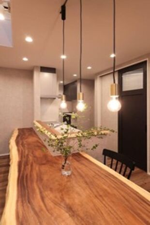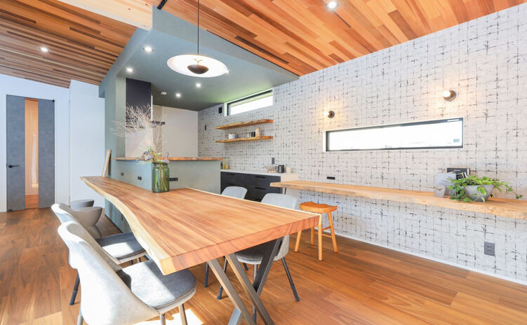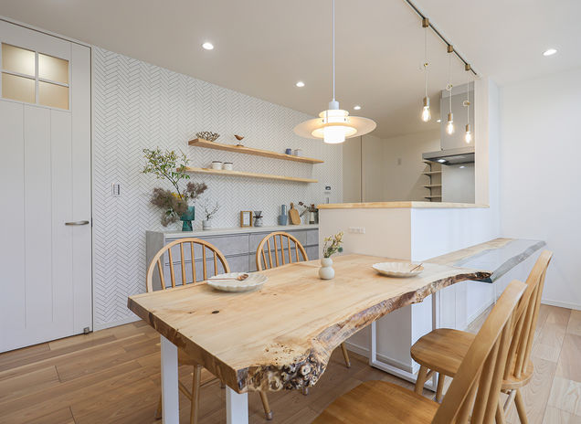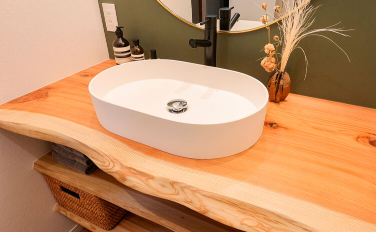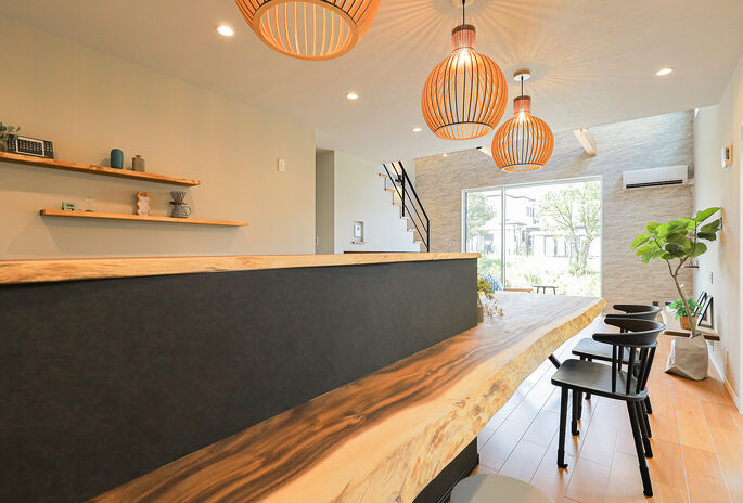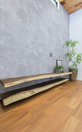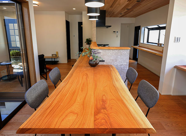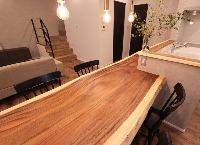 丸ごと1本の天然木を使って、カウンター一体型テーブルや洗面カウンター、ニッチ、棚など様々なデザインを造作。『耳』付きの天然木ならではの存在感が、空間を個性的に仕上げる。木の種類によって表情や雰囲気は多様に。同じ樹種でまとめて統一感を出してもいいし、違う樹種を使って変化を出すのも楽しい。「わが家だけ」のオリジナルな空間づくりが魅力だ。