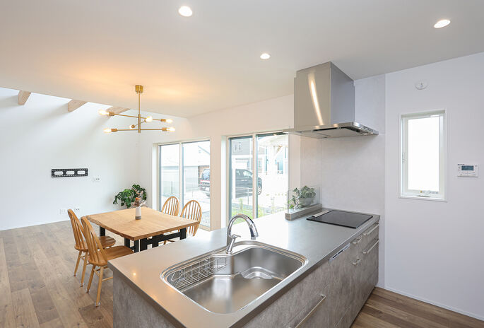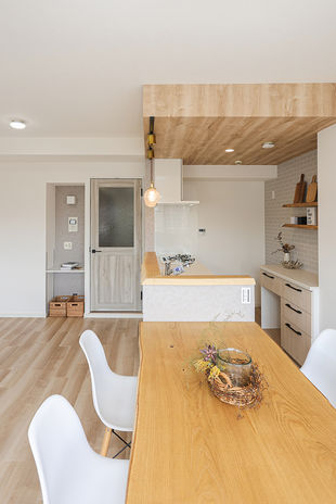 家でもアウトドア気分を味わったり、外遊びの道具の手入れをしたり。自然が大好きな人におすすめの、天然木を生かした家づくり。料理を楽しむキッチンも天然木で心地いい空間に。趣味のグッズがたっぷりしまえる収納スペースや、暮らしやすい回遊動線など、ライフスタイルに寄り添ったプラン提案も魅力だ。