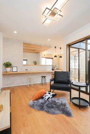 「土地探しも家づくりもできる会社がいいなと思ったんです」とKさん。COLORS工務店は系列会社に不動産部門があり、土地の探し方から相談できると知って訪問したそう。「とても親身に対応してくれて、印象がよかったですね。家づくりにどのくらい費用が掛かるかなど、ネットで調べてもわからないことがあり、不安を抱いていたのですが、相談して解消されました」。系列会社の紹介で土地が見つかり、プランをスタート。インナーガレージや好みの外観デザイン、ヘリンボーンの壁など希望はしっかり伝え、間取りはほぼお任せ。「無駄のない間取りでとても住みやすいです」と満足されている。「照明器具なども自分たちで好きなものを購入し、つけてもらえたのもよかった。アットホームな雰囲気の会社なので、家づくりを私たちも楽しめました!」。