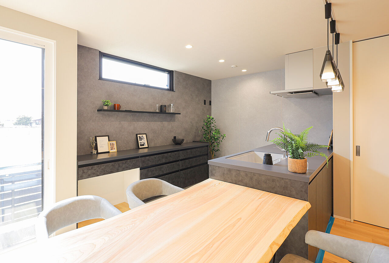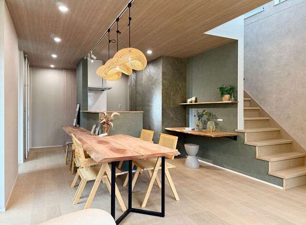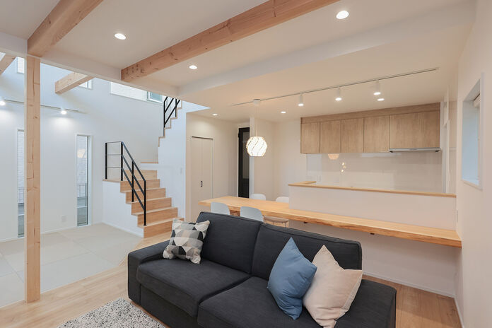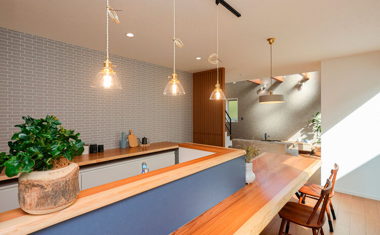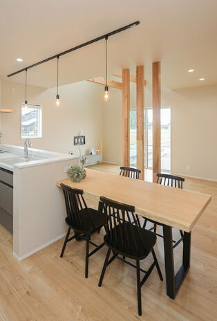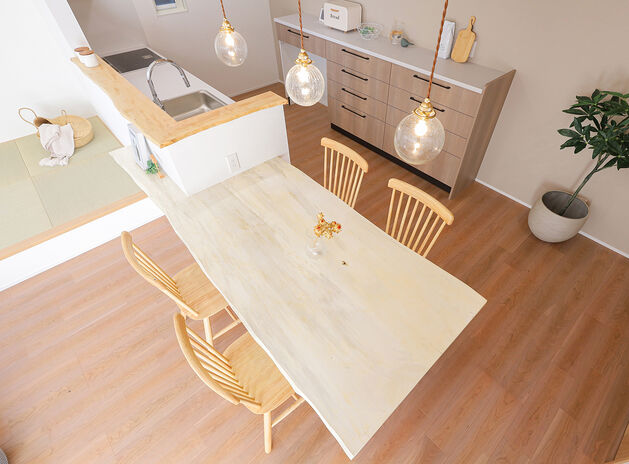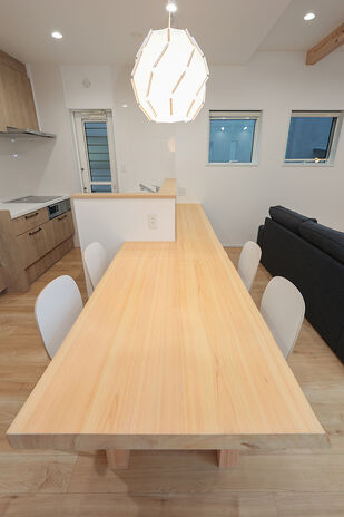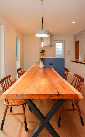 分厚い天然木のテーブルで、食事も友人との集いもお子さんの勉強も。暮らしとともに家族の歴史が刻まれて、天然木ならではの味わいを増す。そんな家づくりを20代・30代のファミリーにおすすめしたい。リビング階段やオープンなキッチン、ぐるっと回れる回遊動線など、家事がしやすく子育てにも適したプランも魅力だ。