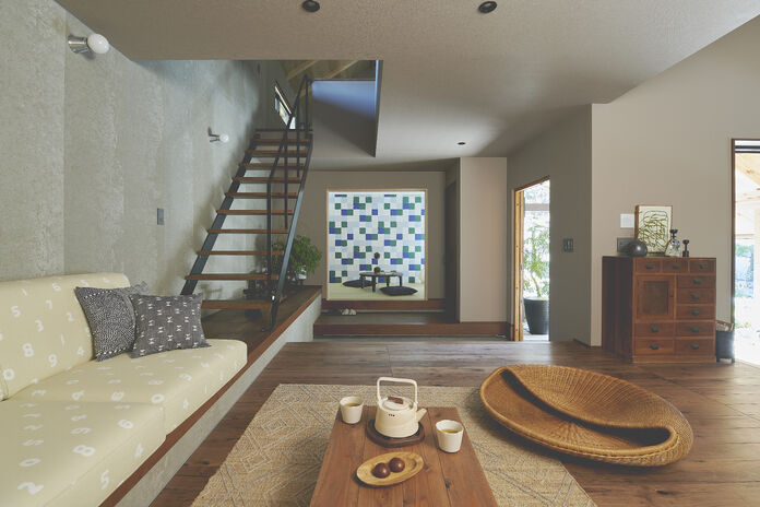 家づくりの相談をしようと同社のオフィスを訪れたMさんは、「展示してある天然木のモンキーポッドが一目で気に入って。この木を使った家を建てたいと思ったんです」。土地の探し方からサポートしてもらい、思い描いた家を建てることができた。同社のファイナンシャルプランナーに資金計画を相談したり、もともと持っていた持ち家の売却についても相談するなど、「家づくり全般に幅広く対応してくれる会社なので、頼りになり、安心してお任せできました」。