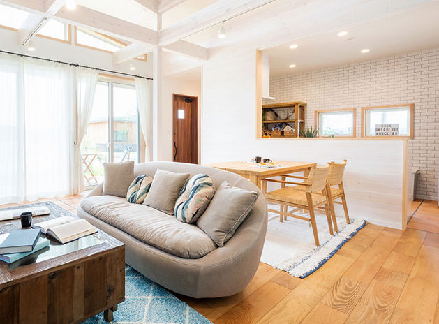ライフスタイルに合わせてDIYやカスタマイズ自在な【HUCK】。自然素材を使ったほとんどすっぴんの内装だから、壁を塗り変えたり、飾り棚を作ったりと、少しずつ暮らしを仕上げ、家族と共にゆっくりと成長する。テイストの幅も広く、カリフォルニアスタイルや和モダン、ビルトインガレージ付きや平屋など、好みに応じて選べるのもうれしい。長く愛せる本物の木の家で、“住まいづくり”を楽しもう。