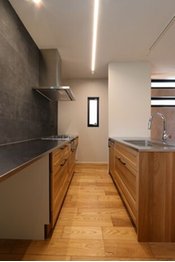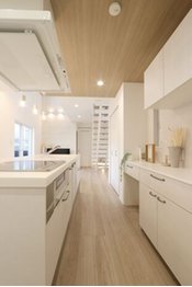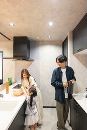 どんな暮らし方をしたいかやライフスタイルをヒアリングしながらプランに反映しているため、家事をラクに行える設計も様々。キッチンの背後から洗面室や浴室につながるプランのほか、室内干しスペースの確保や干す場所と同じフロアに家族分の衣類を収納できるウォークインクローゼットなどを盛り込んで計画。暮らし方に応じてスムーズに家事を行えるようなプランを提案している。