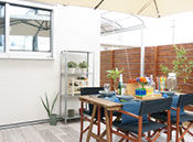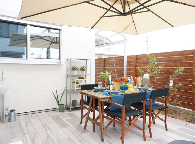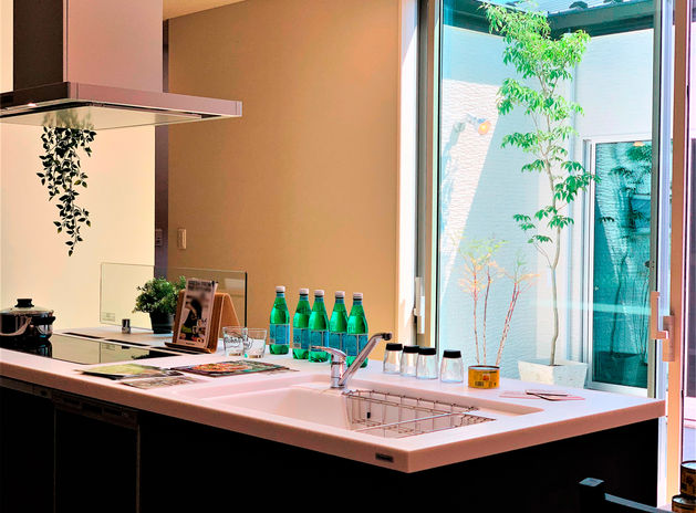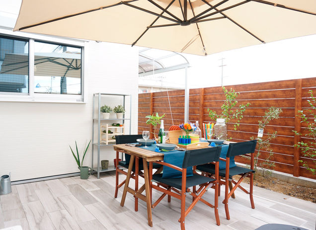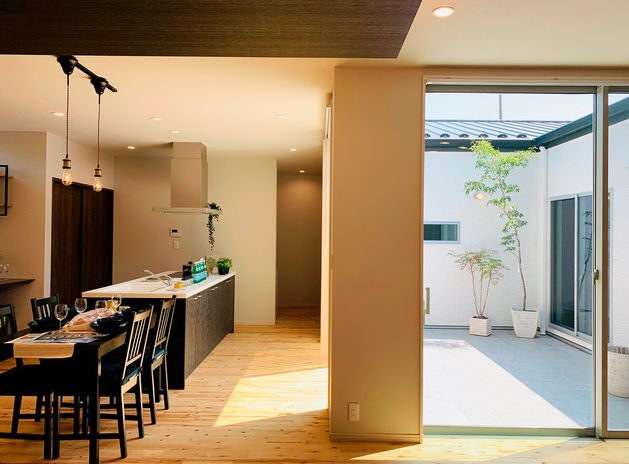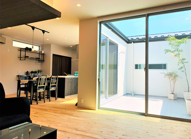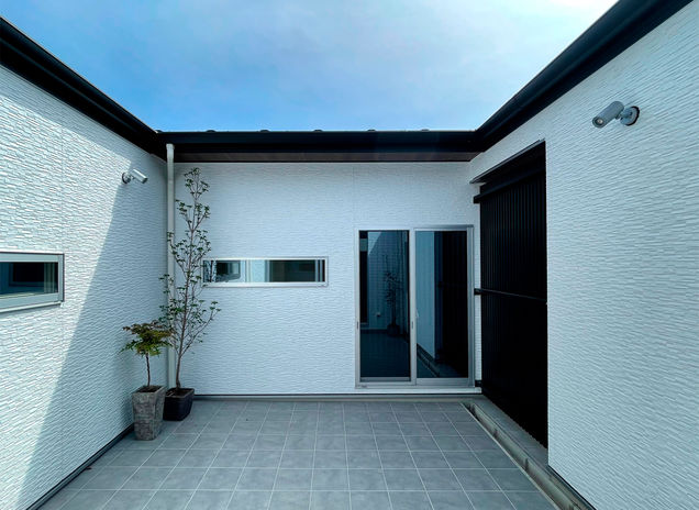 「二世帯住宅はそれぞれの家族がお互いに気を使いすぎないようにすることが大切です」。例えば、写真のような中庭はそれぞれの家族が適度な距離感を保つのに有効なスペース。孫が中庭で遊ぶ姿を祖父母が眺められる、そんなコミュニティ空間としても役立ってくれる。「生活音についても部屋の配置を工夫すれば解決できます。意見調整もご家族の間に入って行いますので、安心してお任せください」。